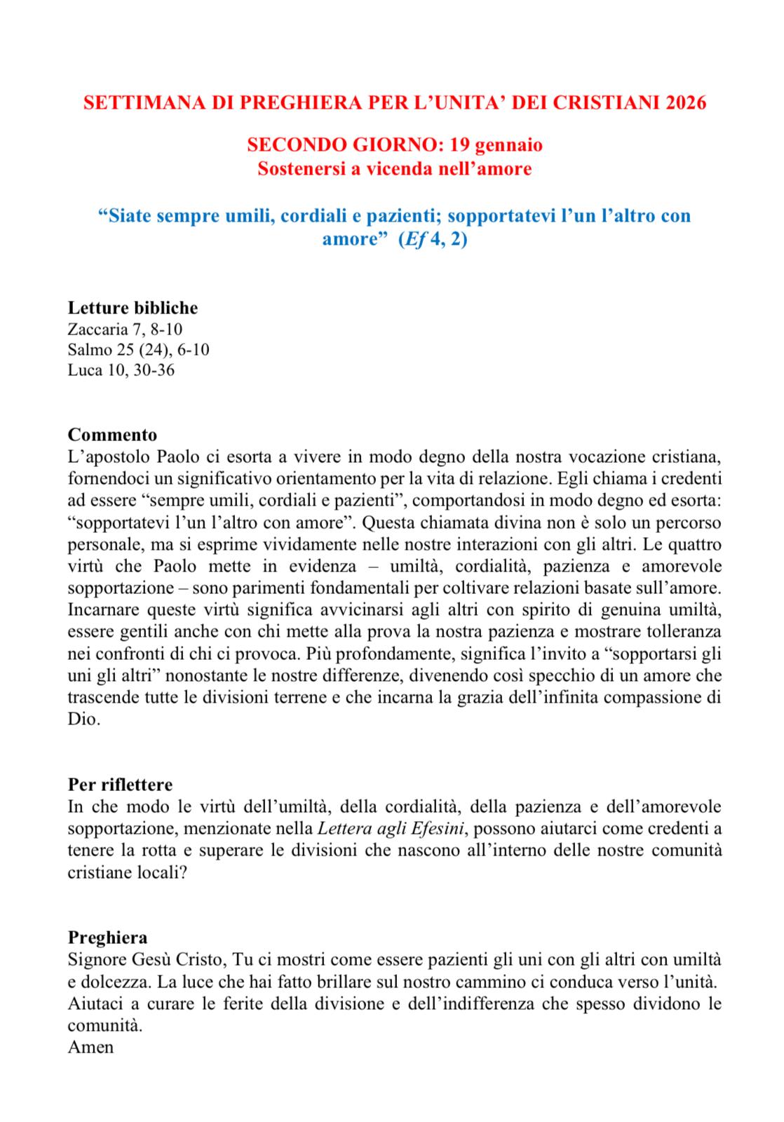 SETTIMANA DI PREGHIERA PER L’UNITA’ DEI CRISTIANI 2026 SECONDO GIORNO: 19 gennaio Sostenersi a vicenda nell’amore Gennaio 19, 2026 26 Facebook