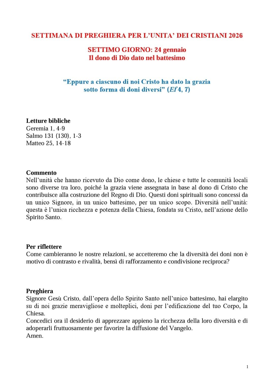 SETTIMANA DI PREGHIERA PER L’UNITA’ DEI CRISTIANI 2026 SETTIMO GIORNO: 24 gennaio Il dono di Dio dato nel battesimo Gennaio 24, 2026 39 Facebook