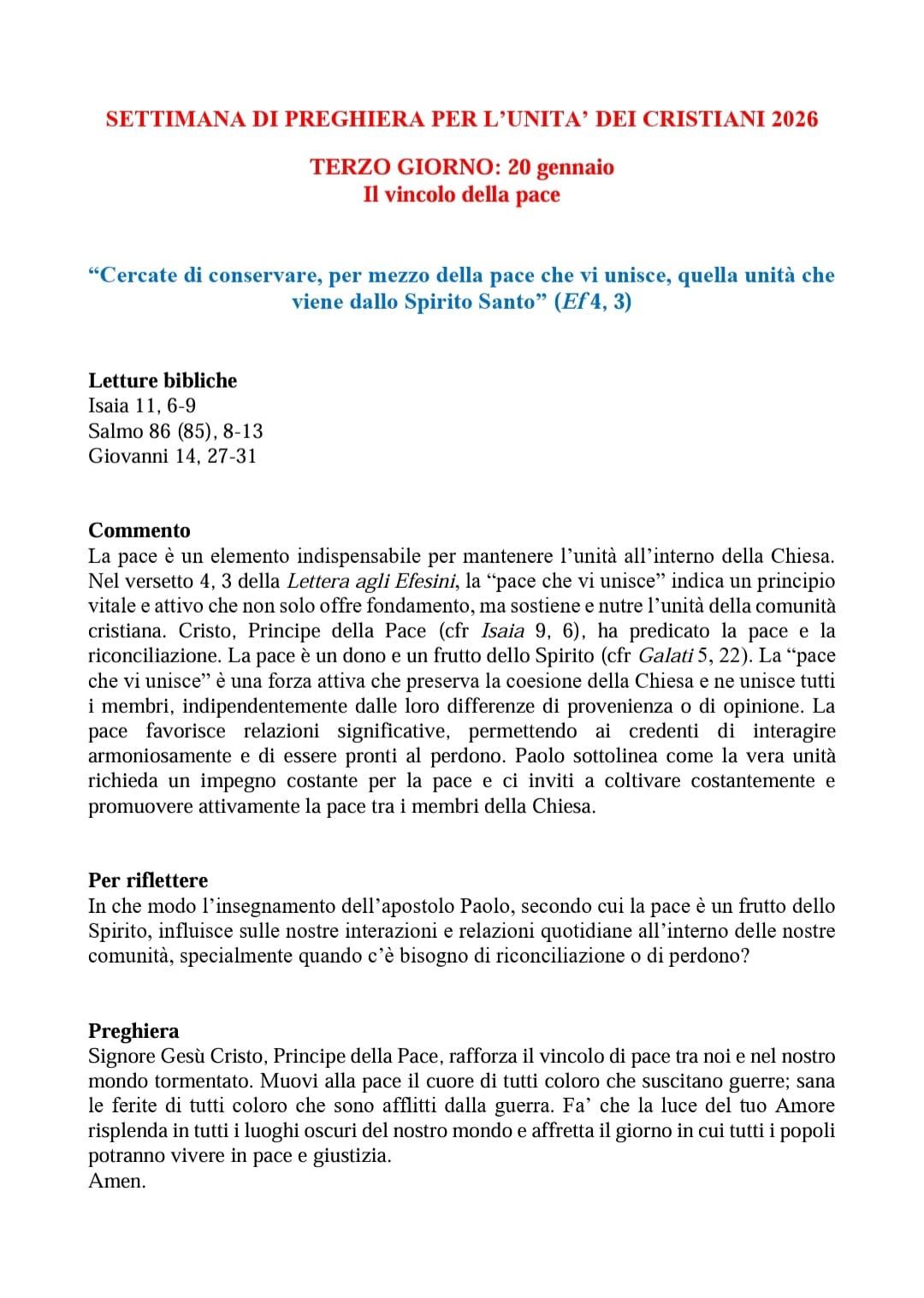 SETTIMANA DI PREGHIERA PER L’UNITA’ DEI CRISTIANI 2026 TERZO GIORNO: 20 gennaio Il vincolo della pace Gennaio 20, 2026 20 Facebook
